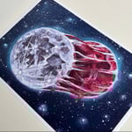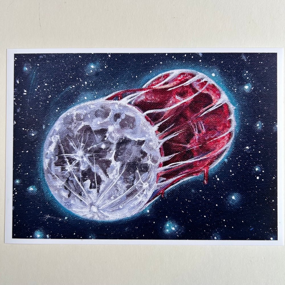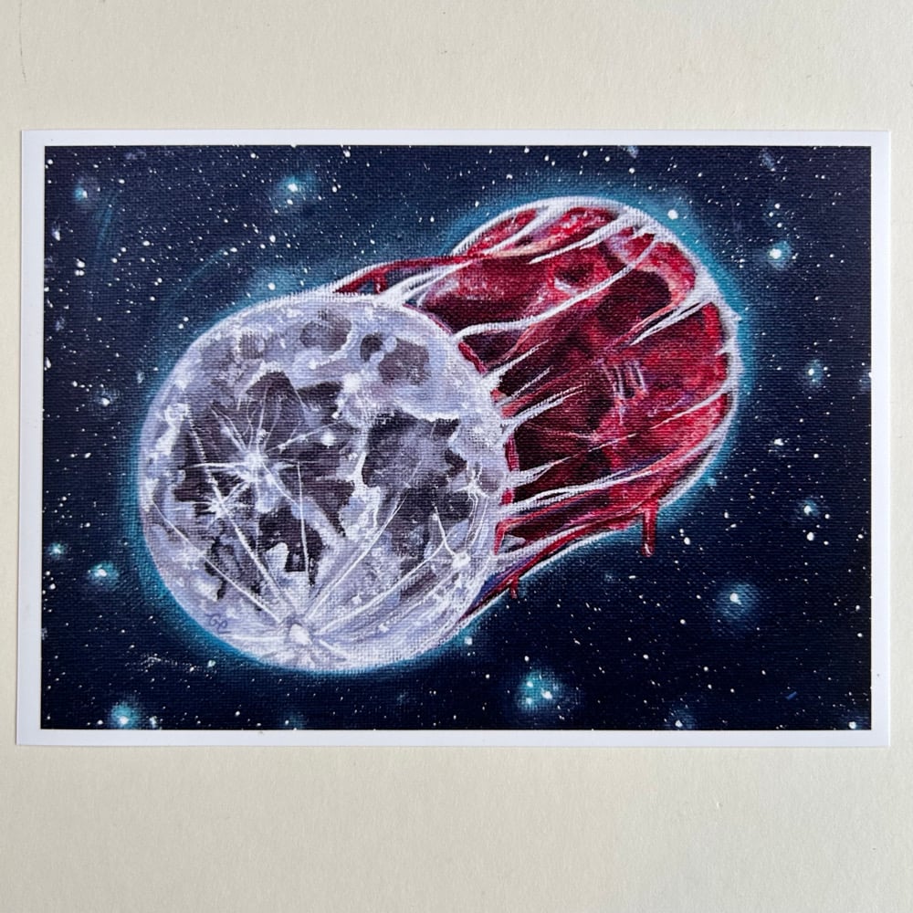 This existential piece is part of a surreal space series that was created to symbolise our connection to this vast universe and space. This piece symbolises our connection to the moon and how we follow the same monthly cycle. How the moon is just as alive as we are.