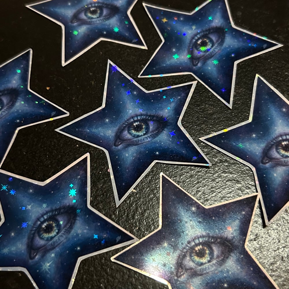 Holographic glossy vinyl stickers of "we’re made of stars" artwork.